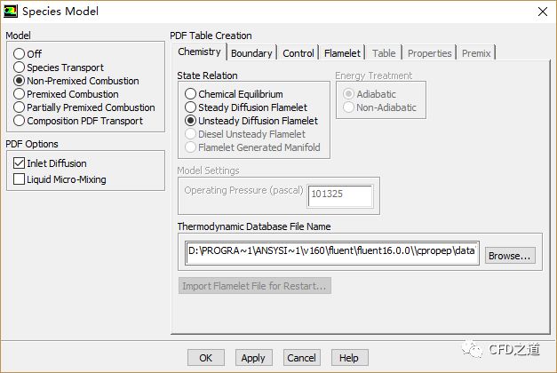 选择模型Non-Premixed Combustion,选择Unsteady Diffusion Flamelet