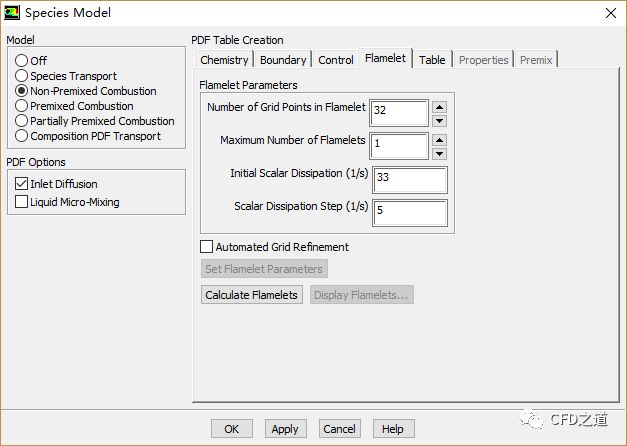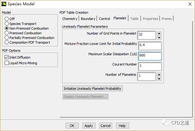 切换至Flamelet标签页,如下图所示设置,点击按钮Initialize Unsteady Flamelet Probability