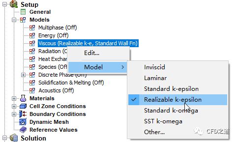 右键选择模型树节点Models > Viscous,选择弹出菜单项Model → Realiazble k-epsilon激活湍流模型