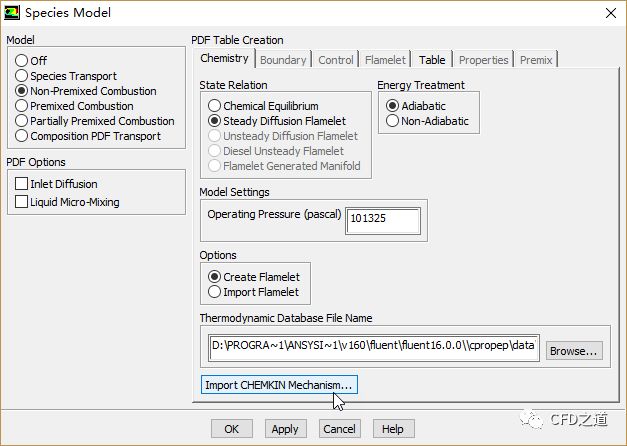 激活模型Non-Premixed Combustion,激活选项Inlet Diffusion,选择Steady Flamelet,点击按钮Import CHEMKIN Mechanism...