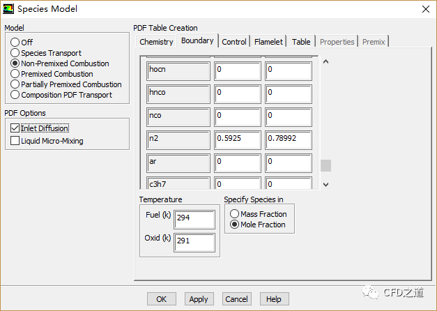 切换至Boundary标签页,设置Fuel及Oxid的温度分别为294K及291K,设置Mole Fraction