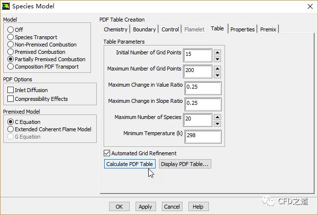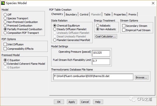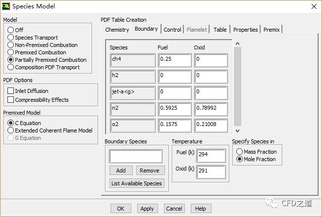 激活Partially Premixed Combustion模型,选择选项Chemical Equilibrium,设置Fuel Stream Rich Flamability Limit为0.7,其他参数保持默认设置