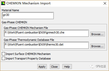 利用菜单File → Import → CHEMKIN Mechanism...导入机理文件grimech30.che及热力学数据thermo30.dat