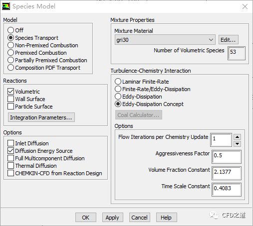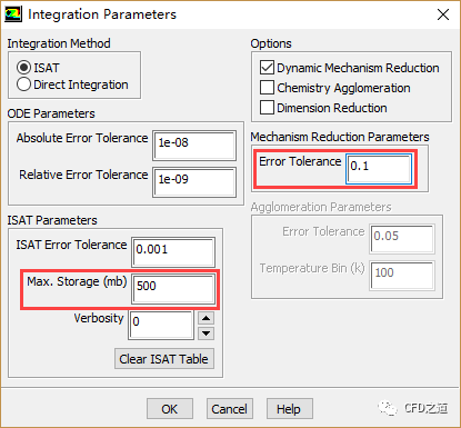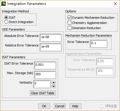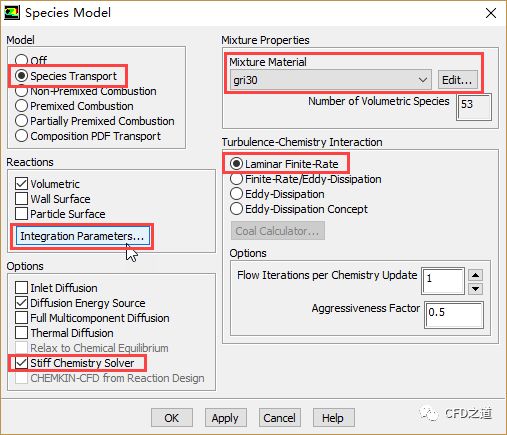 打开组分输运模型,如下图所示,激活Stiff Chemistry Solver,点击按钮Intergration Parameters...打开设置对话框