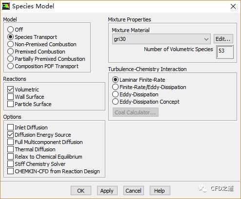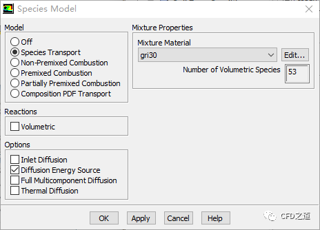 返回至组分输运模型对话框,激活选项Volumetric,其他参数保持默认设置,点击按钮OK关闭对话框