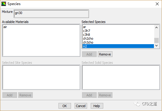 双击模型树节点Materials > Mixture > gri30弹出材料定义对话框,点击Edit...按钮弹出组分编辑对话框,调整N2组分位于列表最下方