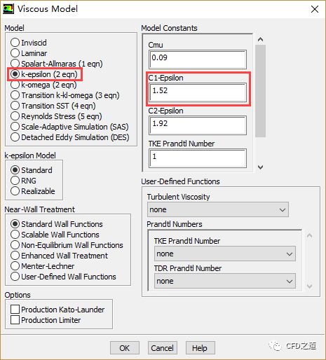 激活Standard k-epsilon湍流模型,修改模型常数C1=1.52