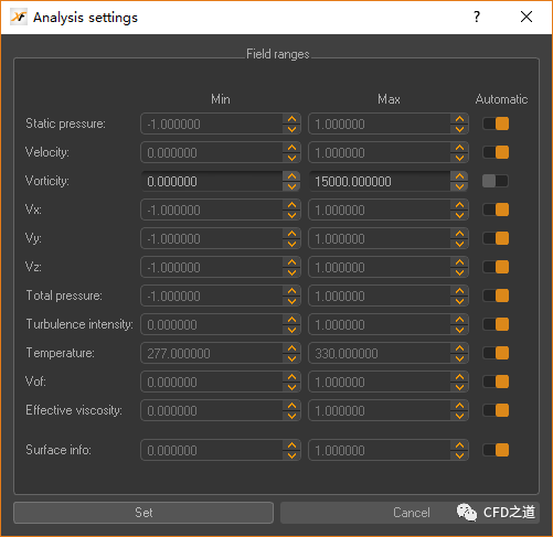 点击工具栏按钮Analysis settings,在弹出的对话框中设置Vorticity范围为0~15000,如下图所示