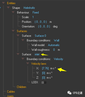 设置Boundary conditions为Velocity,设置X方向速度为7.76 m/s