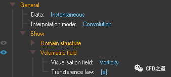 激活VolUmetric field显示,变量选用Vorticity,设置Transference law为a