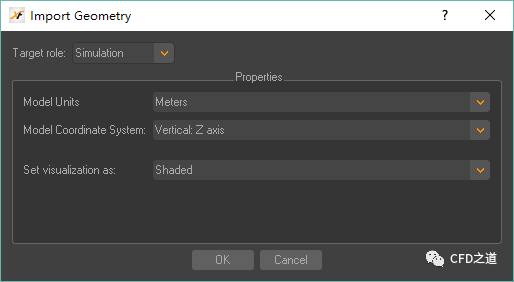 弹出的选项设置对话框中,设置model Coordinate System为Vertical:Z axis,点击OK按钮导入几何