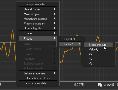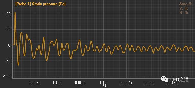在Function Viewer点击鼠标右键,选择菜单项Probes → Probe 1 → Static pressure显示监测点静压随时间分布曲线