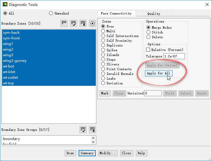 弹出的设置对话框中采用默认参数,点击按钮Apply for All可清除掉几何中的自由边