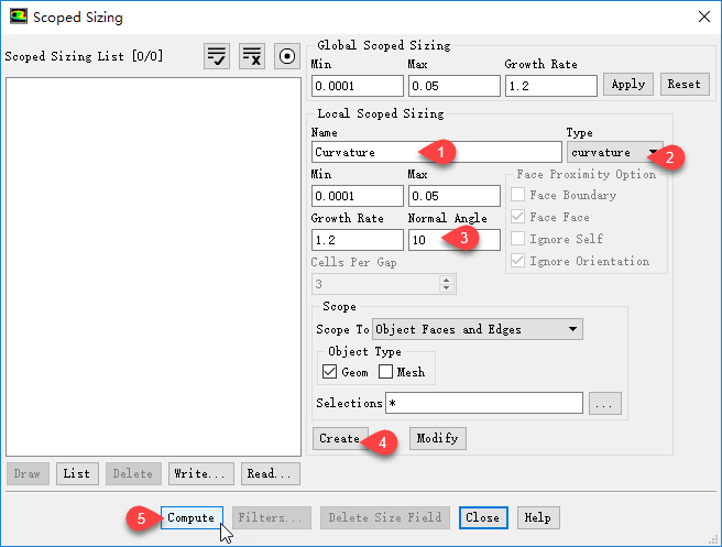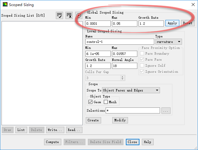 设置Global Scoped Sizing,设置Min为0.0001,设置Max为0.05,设置Growth Rate为1.2,点击Apply按钮