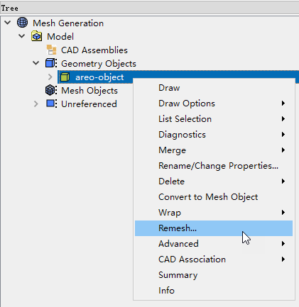 右键选择模型树节点areo-object,选择右键菜单Remesh...