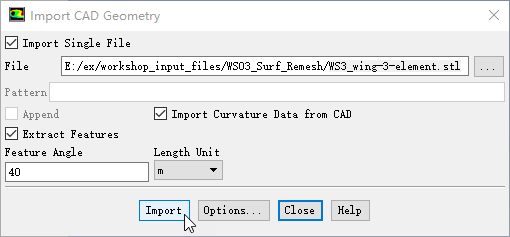 选择菜单File → Import → CAD,选择几何文件WS3_wing-3-element.stl