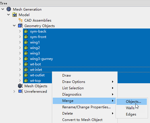 弹出对话框中输入名称为aero-object,点击Merge按钮合并所有几何