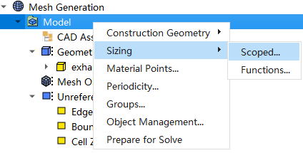 几何模型导入之后,可通过右键点击模型树节点Model,选择菜单项Sizing下的Scoped…及Functions…来实现。