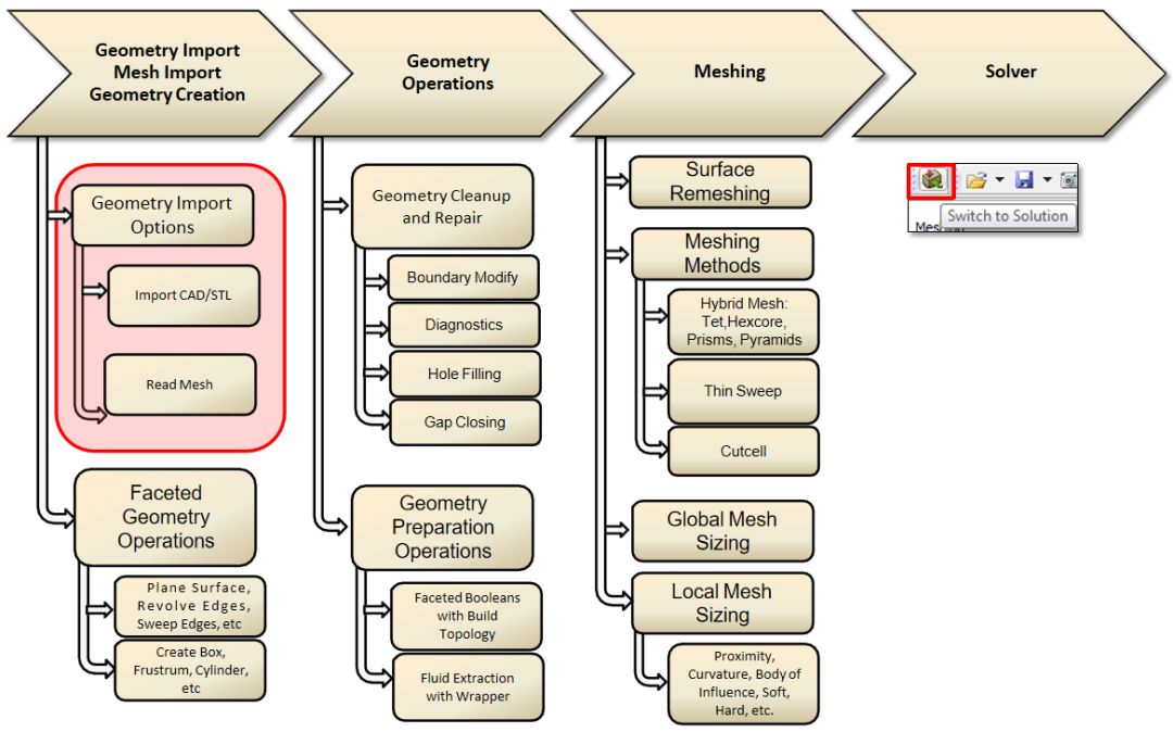 注:可以导入Mesh格式文件,如CGNS、PATRAN、NASTRAN、Fluent 2Dd等;STL文件通过CAD导入;原始CAD格式也是通过CAD导入,如STEP、IGES、ACIS、Parasolid等,这些格式通过Workbench CAD Reader读入。