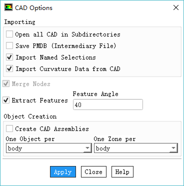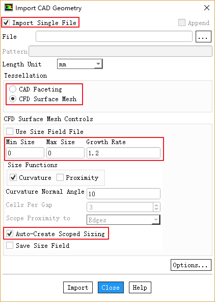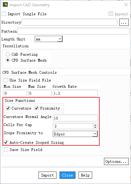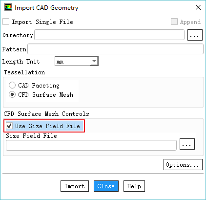Tessellation:指定文件导入形式,以CAD刻面或CFD面网格形式导入。若选择以CFD Surface Mesh方式导入,则可以指定Size Field参数,软件在导入几何过程中自动对几何面进行重构。