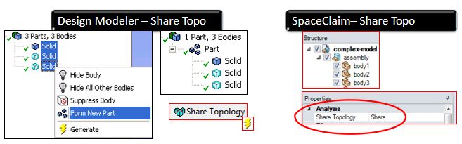 灵活运用共享拓扑以避免在导入组合体时出现几何面连接问题。DM与SCDM中均有共享拓扑的处理方式,其中DM中通过Form New Part实现,而在SCDM中,则通过设置几何体Share Topology为Share来实现。