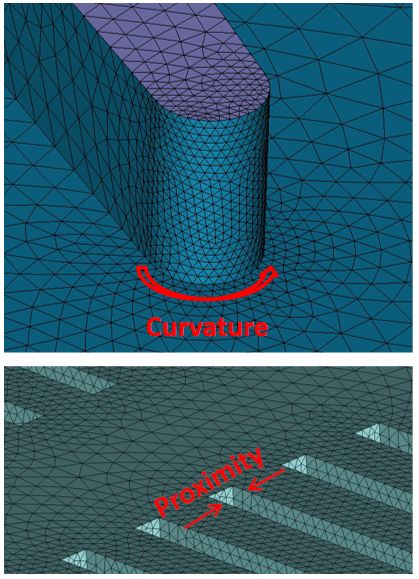 尺寸功能中最重要的两个参数为Curvature及Proximity,如下图所示,Curvature控制曲率几何的网格加密,Proximity控制狭缝间隙中的网格分布。