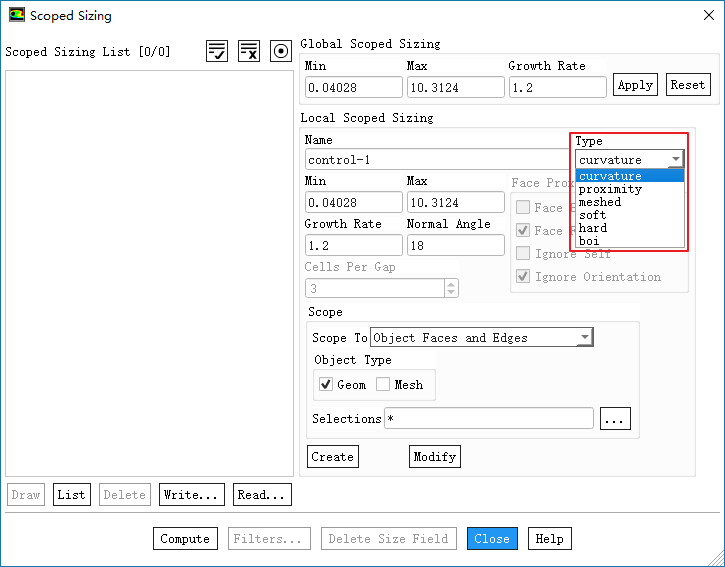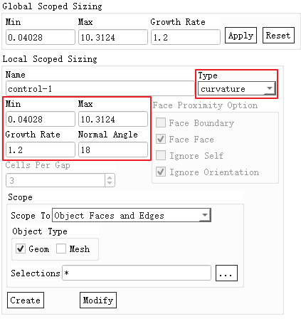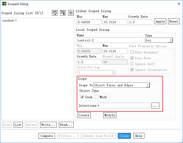 Scoped Sizing的创建方法与size function类似,不同的地方是Scoped Sizing可以指定作用对象(geom和/或Mesh),这里就不再重复了。