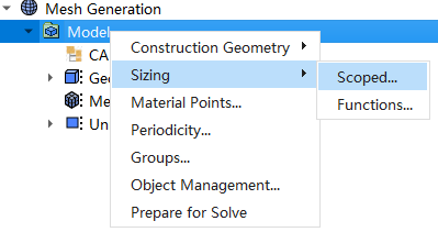 在导入几何模型之后,可以通过右键选择模型树节点Model,选择菜单项Sizing进行尺寸功能指定。如下图所示。
