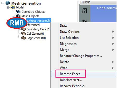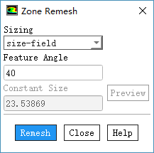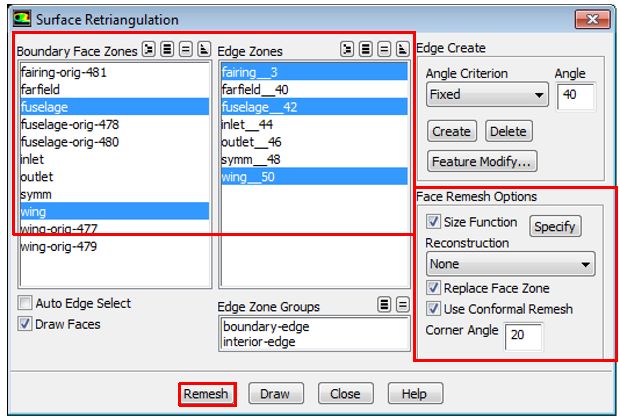 对话框中选择需要进行网格重构的边界面或边界线,设置相关参数,点击Remesh按钮进行网格重构