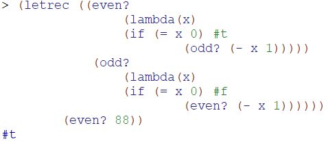 上面的操作过程中,内部定义了两个判断过程even?和odd?,这两个过程是互相递归引用的,如果将letrec换成let或let*都会不正常,因为letrec是将内部定义的过程或变量间进行相互引用的。看下面的操作: