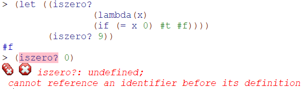 let的绑定在过程内有效,过程外则无效,这和上面提到的过程的嵌套定是一样的,上面的iszero?过程在操作过程内定义并使用的,操作结束后再另行引用则无效,显示过程未定义出错信息。