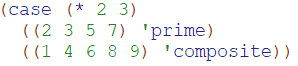 上面的例子返回结果是composite,因为列表(1 4 6 8 9)中含有表达式(* 2 3)的结果6;下面是在Guile中定义的func过程,用到了case结构:
