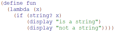 如执行 (fun 123) 则返回值为"not a string",这样的功能在C++或JAVA中实现的话可能会很费力气。