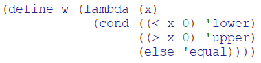 上面程序代码中,我们定义了过程w,它有一个参数x,如果x的值大于0,则返回符号upper,如x的值小于0则返回符号lower,如x 的值为0则返回符号equal。