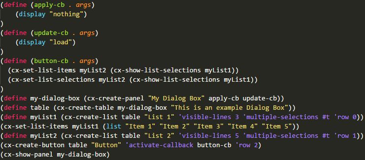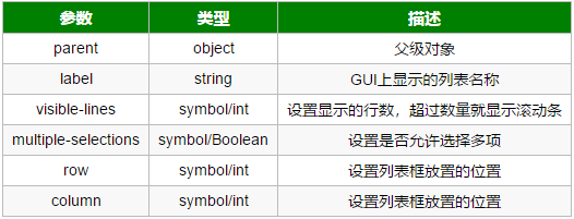 注:参数visible-lines, multiple-selections, row, column为可选参数。若不设置这些参数,则visible-lines默认为10行,multiple-selections默认为#f,row与column默认均为0。