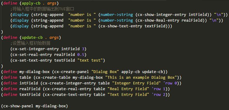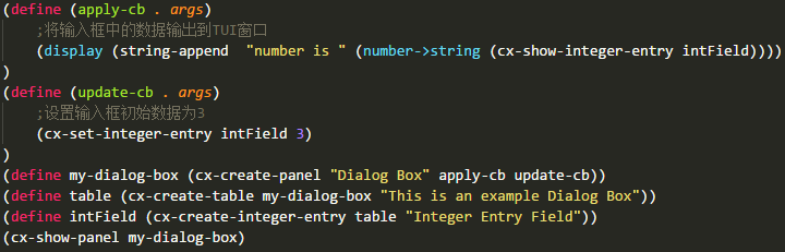 利用函数cx-create-integer-entry可以创建整数输入框。该函数使用方式为: