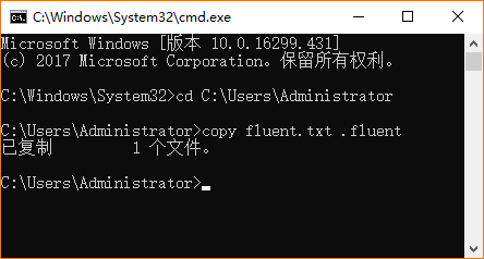 启动windows命令行,进入路径C:UsersAdministrator,利用命令copy fluent.txt .fluent创建.fluent文件