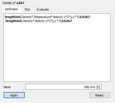 输入框中输入lengthInt(Density*Temperature*Velocity u*2*pi*Y)@X267 /lengthInt(Density*Velocity u*2*pi*Y)@X267,点击Apply可得到x=2.67 m位置平均温度为306.041 K
