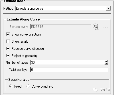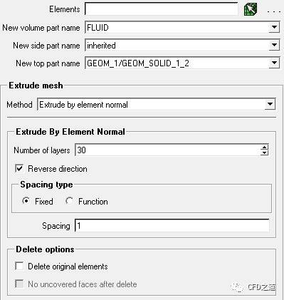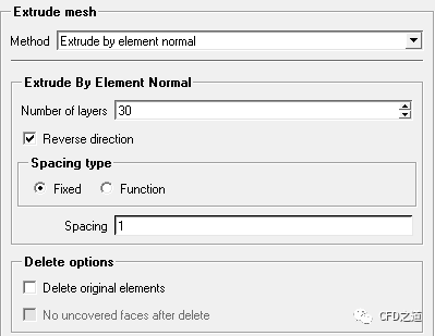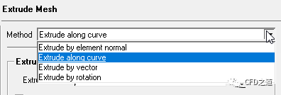 选择Method中的选项为Extrude by element normal可采用法向拉伸方法。