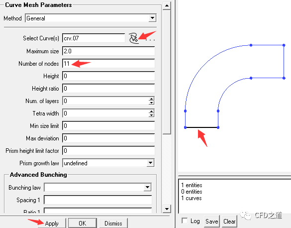 参数设置窗口中,选择几何的底部边,设置Number of nodes为11,点击Apply按钮为该边指定网格尺寸