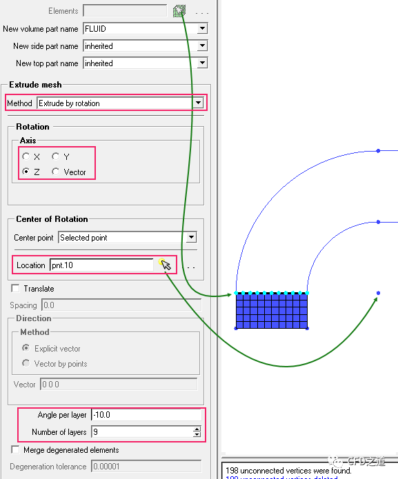 拉伸时可选择选项Delete original elements删除初始线网格,这样可以防止最终形成的网格中存在重复节点。
