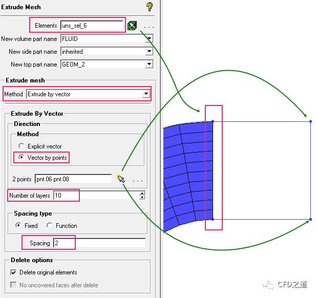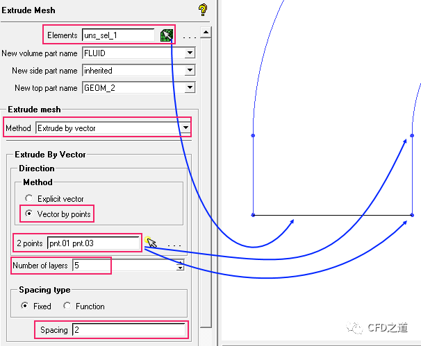 如下图所示,选择采用Extrude by vector方法,并选择两个几何点定义向量,设置网格间距为2,拉伸层数为5,点击左下角Apply按钮生成网格