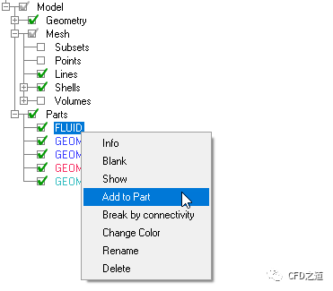 右键选择模型树节点Part > FLUID,点击弹出菜单项Add to Part