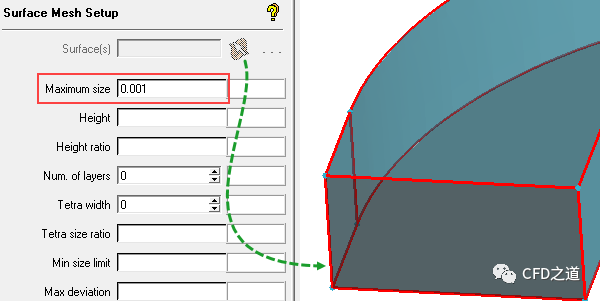 属性设置框中选择如图所示的面,设置Maximum size为0.001,点击左下角Apply按钮确认设置