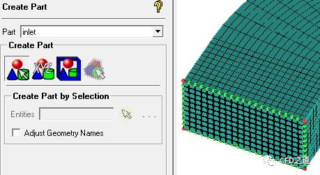 新建Part,命名为INLET,选择如图所示的面网格,将其添加至INLET中