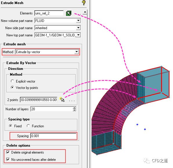 选择Method为Extrude by vector,其他选项如下图所示设置,点击Apply生成拉伸网格