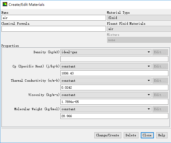 鼠标双击模型树节点Materials > fluid > air,弹出的对话框中设置Density为ideal-gas,点击按钮Change/Create确认修改参数