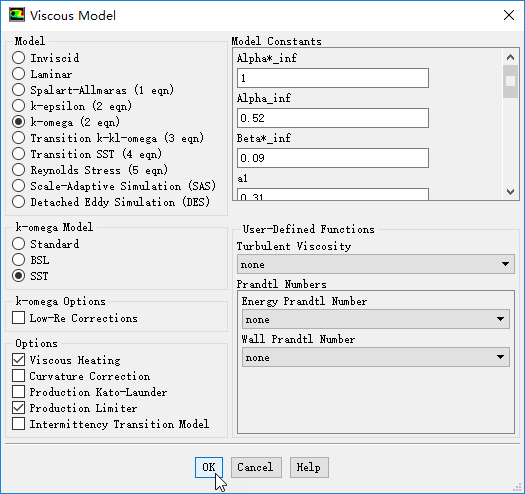 双击模型树节点Viscous,弹出对话框中选择k-omega模型,选择SST子模型,并激活选项Viscous Heating