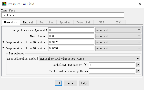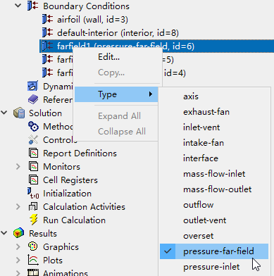 右键选择模型树节点Boudary Conditions > farfield1,选择弹出菜单Type → Pressure-far-field,弹出压力远场条件设置对话框