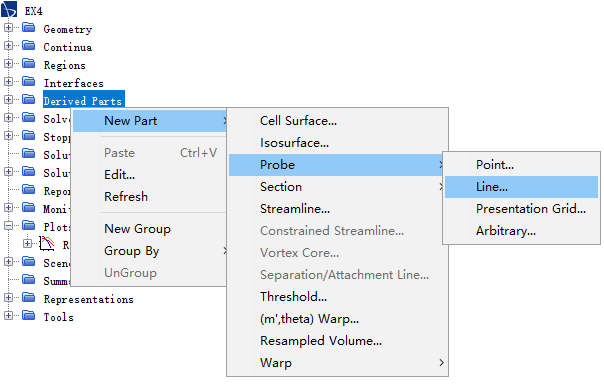 右键选中模型树节点Derived Parts,点击弹出菜单New Part > Probe > Line…新建线
